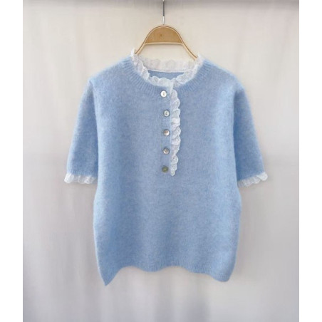 Pull dentelle col, boutonnière et manches courtes
