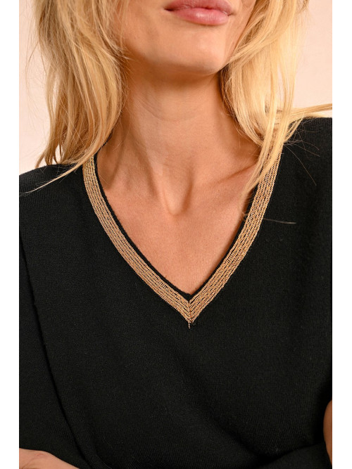 Pull col V gansé chaînettes dorées manches longues Molly Bracken.
